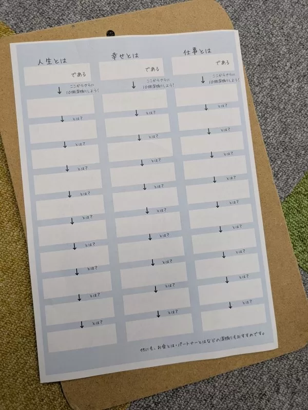 第2回は自分の潜在意識(普段あまり意識しない思い込みや価値観)を知る「深堀りワーク」を行いました。「人生とは●●である」「幸せとは●●である」「仕事とは●●である」の3つのテーマをもとに、自分の潜在意識を紙に書き出していきました。